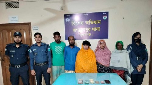 জগন্নাথপুরে পুলিশের বিশেষ অভিযানে মহিলাসহ প্রতারক চক্রের ৫ সদস্য গ্রেফতার